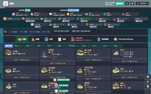 别的不多说,需要单独聊的是那个嘀,即tick的诡异翻译,城镇的时间不会自动流逝需要消耗tick手动操作,资源项都在储量后表明了每tick的增量,消耗tick资源就会进行对应的增减变化,需要注意的是你的仓储,仓储堆满后再消耗tick就会浪费,所以请及时扩大仓储和消耗或丢弃资源。tick每过一定现实时间自动获得,其速度和你城镇发展的水平正相关。