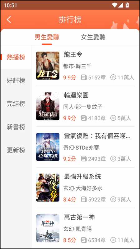 手机免费听小说app采用了全新的推荐引擎算法,可以根据用户的习惯自动匹配到符合口味的小说作品,这样一来就能够解决了相关用户小说荒的问题。同时,该软件也支持排行榜功能,可以根据热度为用户推荐各种小说,让用户可以走在潮流前端。此外,该软件还加入了发音、定时、背景、语速等方面的修改操作,确保为用户营造出一个不错的听书环境。