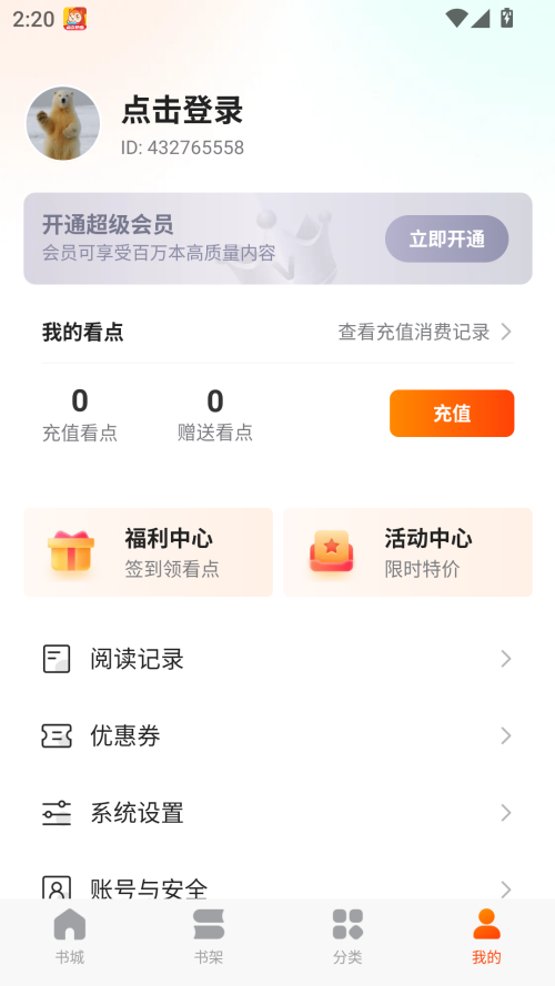在“点众快看小说”软件窗口中,选择【我的】图标进入。
