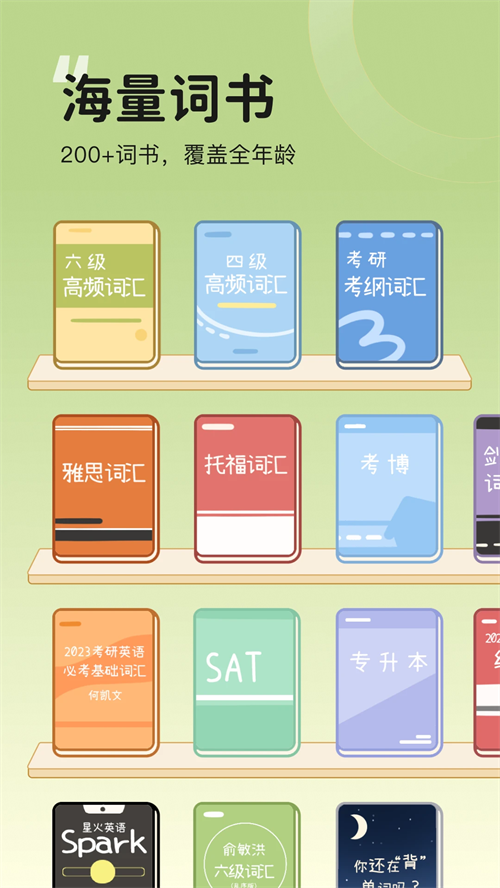 海量词库:四级/六级/考研/托福/雅思/托业/计算机/BEC/SAT/GRE/GMAT...权威词库让你挑选,让学习更舒心。