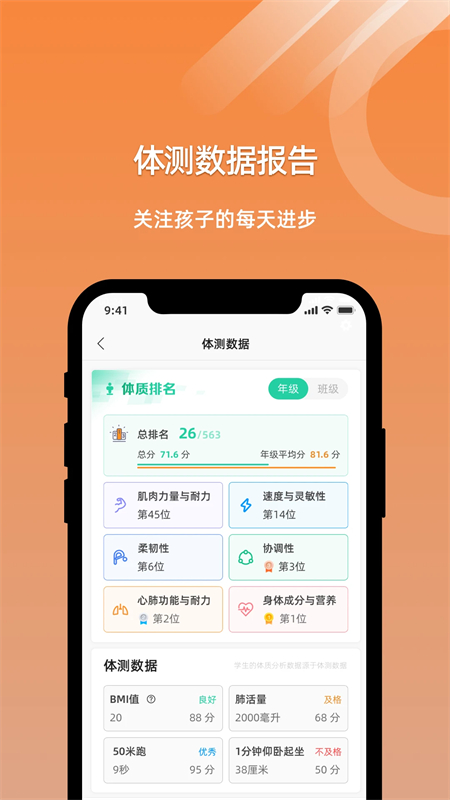 学生可以在“学生端”轻松完成体育作业,练习体测项目,获取体测数据分析、生成作业报告、教学指导等多项服务,邀请家人一起见证学生成长。