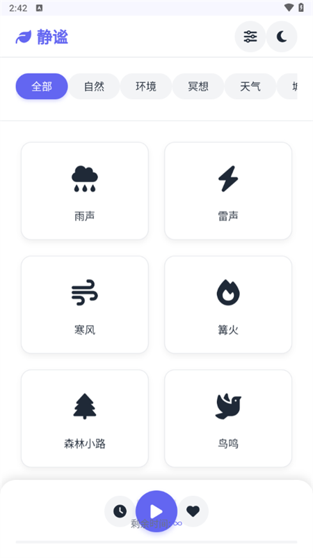 软件设计了白天和黑夜两种模式,用户可以根据时间自由切换,当用户想睡觉时,软件还提供了白噪音催眠模式,用户可以选择雷声、雨声、风声等自然声音帮助自己快速入眠,是一款非常全面的手机软件。