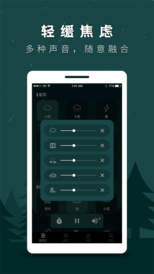 2、来到“自定义”页面用户可以选择喜欢的白噪音聆听,放松身心。
