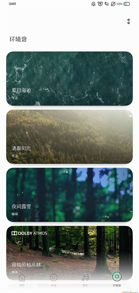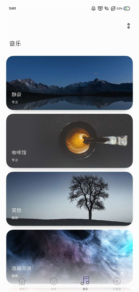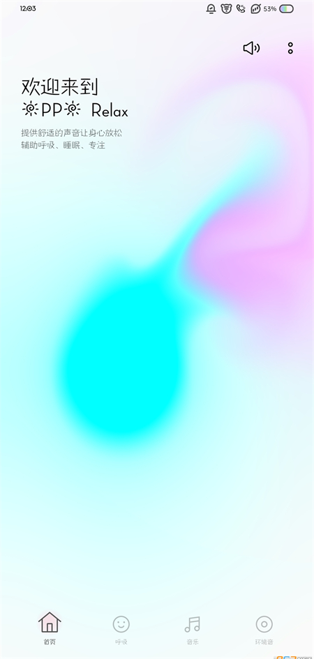 4、目前包括四个板块:首页、呼吸、音乐、环境音。