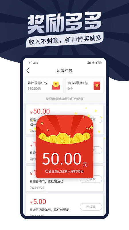 不定期现金红包直接领,接单奖励活动时时有,积分商城更有博世批头套装、手电钻,得力工具套装等好礼兑换。