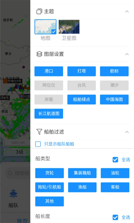 1、长江北斗船舶筛选功能可根据船舶类型、长度、状态、数据来源等条件,过滤符合要求的船只。