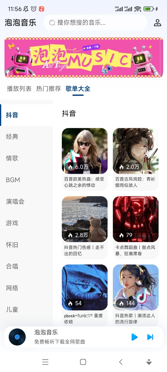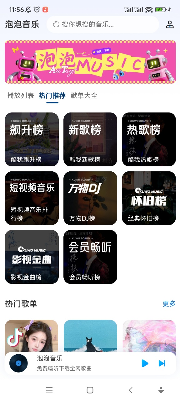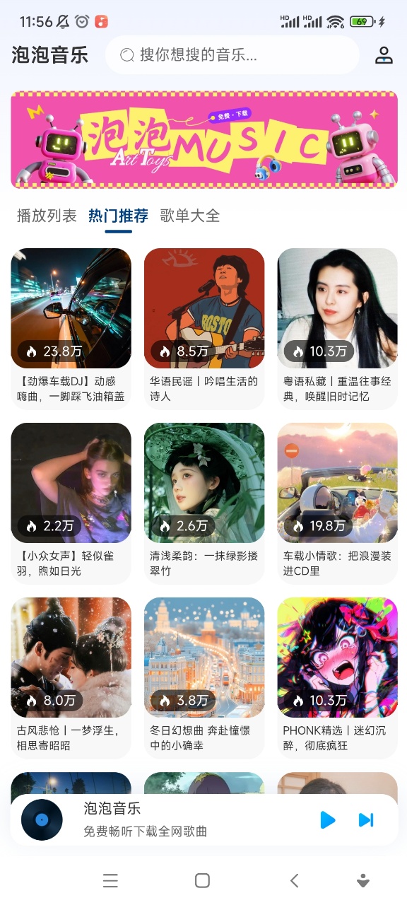 泡泡音乐app官方正版安装版是一款专门为所有音乐爱好者而准备的手机听歌软件,这款软件不仅提供了流行、摇滚、电子、古典等多种类型的音乐资源。而且我们还可以通过泡泡音乐最新版本来使用排行榜、热门推荐、搜索等多种功能,从而让你获取到自己需要的音乐。
