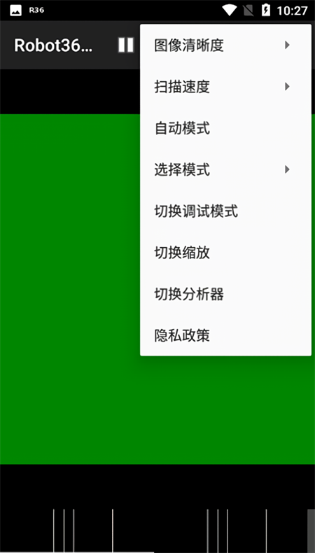 Robot36中文版是一款体积小巧、功能强大的手机SSTV解码软件,主要适用于慢扫描电视等方面。这款软件采用了简洁直观的操作界面、傻瓜式的操作步骤,相关用户在这里可以在这里调用Robot、PD、Martin、Scottie、Wraase等模式,能够将电台传输的音频信号解码为图像,能够很好的满足了相关无线电爱好者的使用需求。