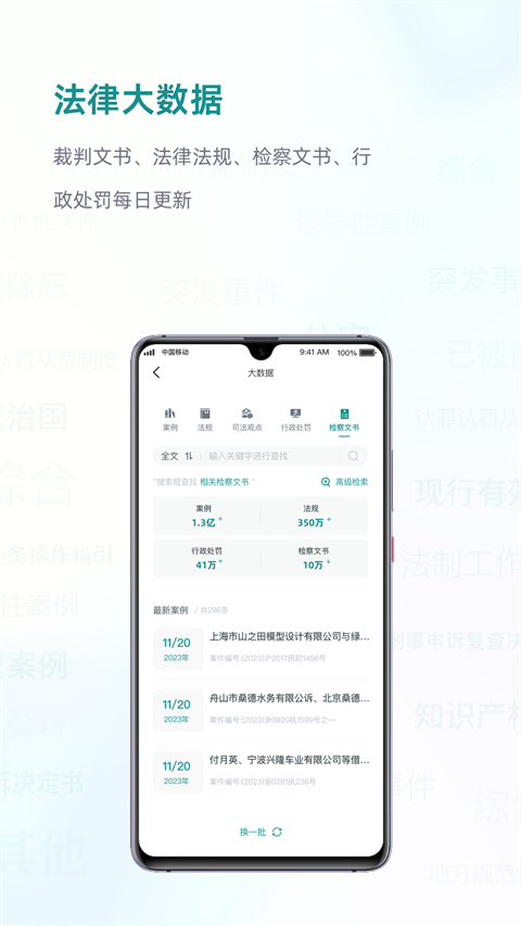 4、海量的法律法规、司法解释、法律程序、智能化文件管理。