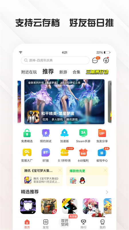 1、在首页,我们能够看到免费精选、预约测试、加速版、Steam手游、虫友分享、官服大厂、BT版、0.1折秒杀、648福利、省钱中心等一系列板块;