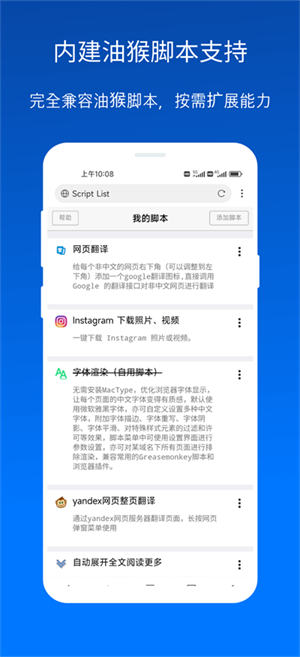 无需安装第三方脚本管理器,内建支持油猴脚本(GreaseMonkey,Tampermonkey),兼容大部分油猴脚本,极大的提升了浏览器的能力。
