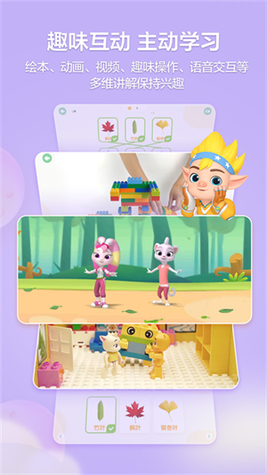 根据儿童绘本、视頻、动漫、手机游戏等丰富多彩的学习方式,趣味性冲关、每日任务挑戰、录音配声、视频语音评测等互动式学习方式,维持孩子的学习激情。