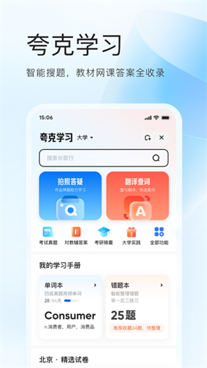 捷径以及小工具这两栏能满足大家的绝大多数需求,其中捷径一栏包括热搜榜、每日小科普、精选壁纸、夸克学习、拍照搜题、夸克网盘、垃圾分类等等各种功能,因此夸克浏览器是一个不错的学习娱乐工具。作为学生,夸克学习和拍照搜题这两个功能可以提高学习效率,能帮助你筛选掉不少垃圾信息。小工具一栏则包括夸克翻译、考试查询、扫描提取文字、查快递、计算器、汇率计算等实用工具。