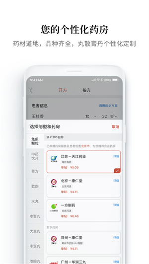 - 集成患者管理、问诊单、门诊信息卡片、方案制定、线上购药、随访复诊、疗效反馈等中医日常工作中常用功能