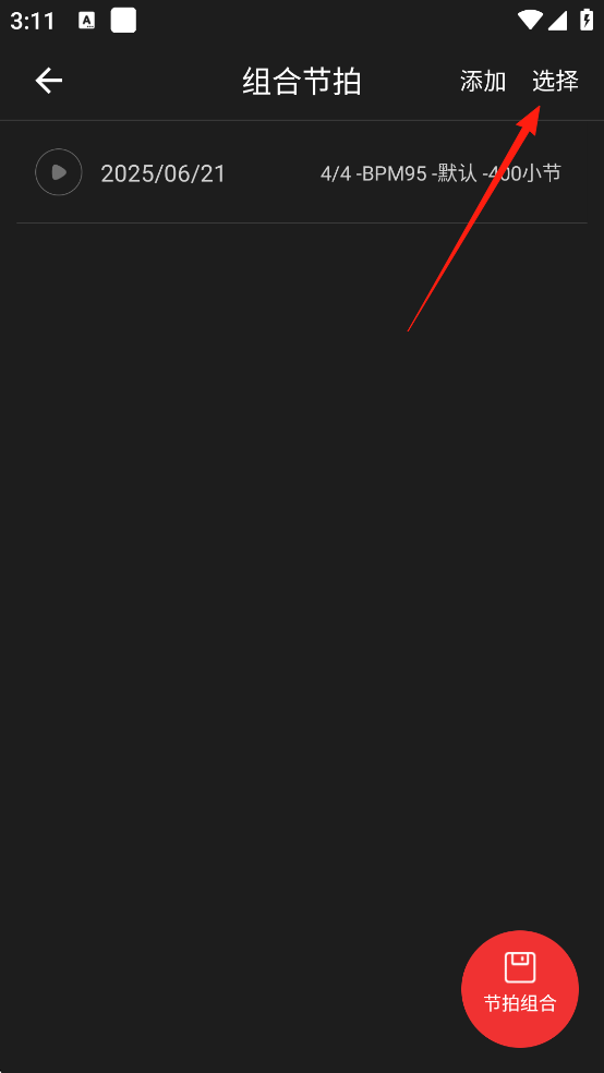 2、进入【组合节拍】界面后,可以看到自己已经添加的节拍,点击【选择】