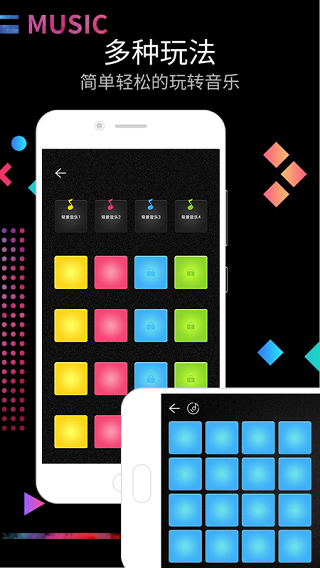 每个打击垫都是一个音轨,不断点击制作电音旋律,一键录制,保存并分享。
