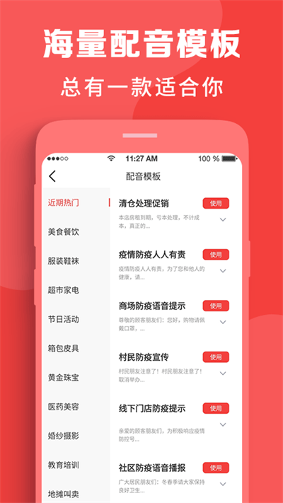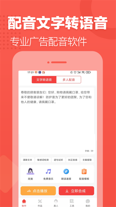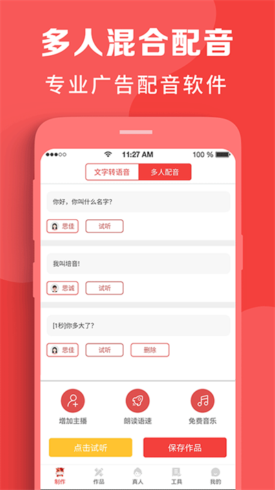 1、广告配音:商场广告促销、地摊叫卖、企业宣传、影视配音等。