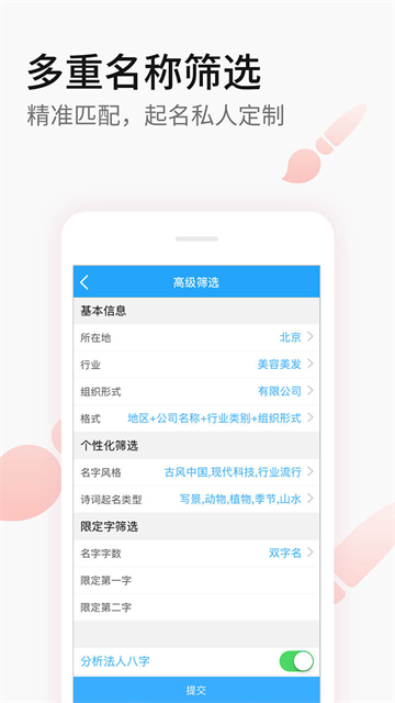 通过按照城市、行业、名称风格、意蕴风格、限定字筛选,精准匹配起名界的私人定制!