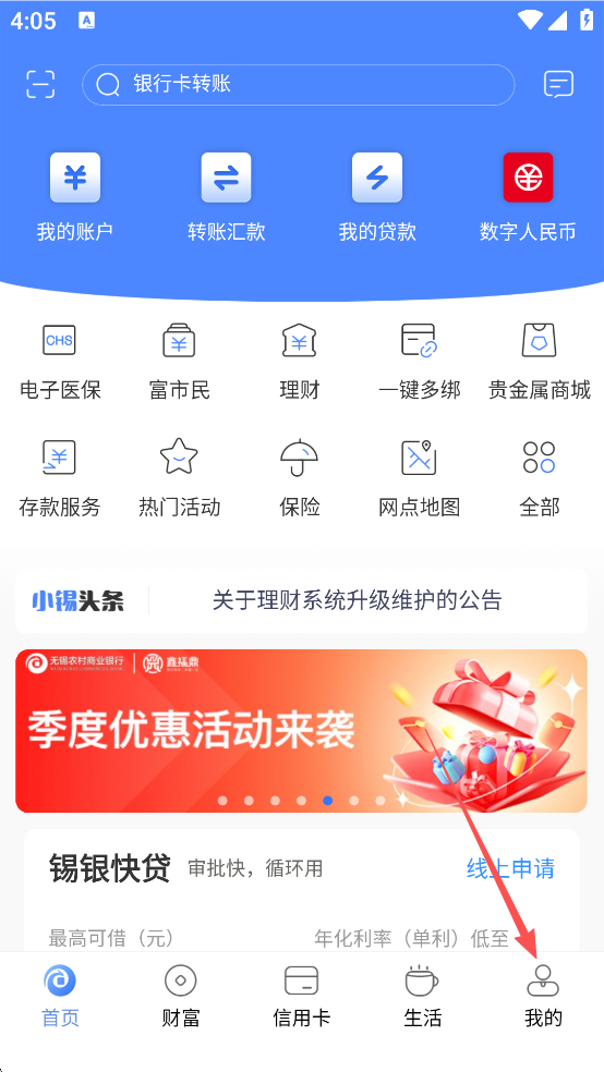 1、打开无锡农商银行App,点击【我的】