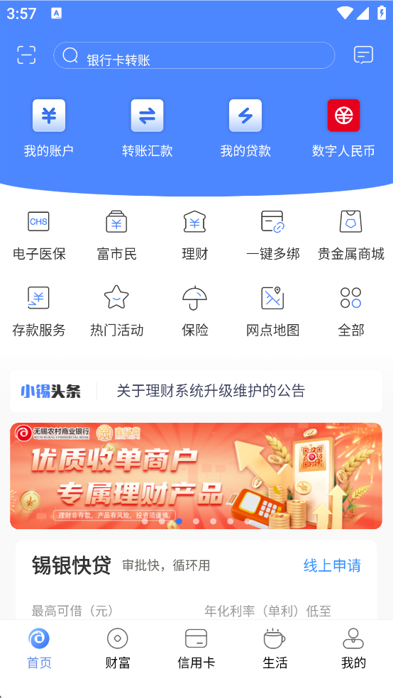 v4.4.8无锡农商银行App是专为手机银行客户打造的移动金融服务平台,提供账户管理、转账汇款、投资理财、生活缴费及信用卡服务等功能,还整合了本地化便民服务,如整合了水电燃气缴费、社保公积金查询、交通罚款代缴等。无锡农商银行App采用了数据全程加密、短信验证、交易密码错误次数限制等机制,并支持指纹或人脸识别等生物识别技术登录,以保障交易安全!
