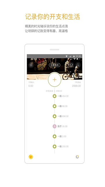 多样图标精细统计开支去向,直观展示你的账单流水。精美的时光轴让琐碎的记账变得有趣、高逼格。