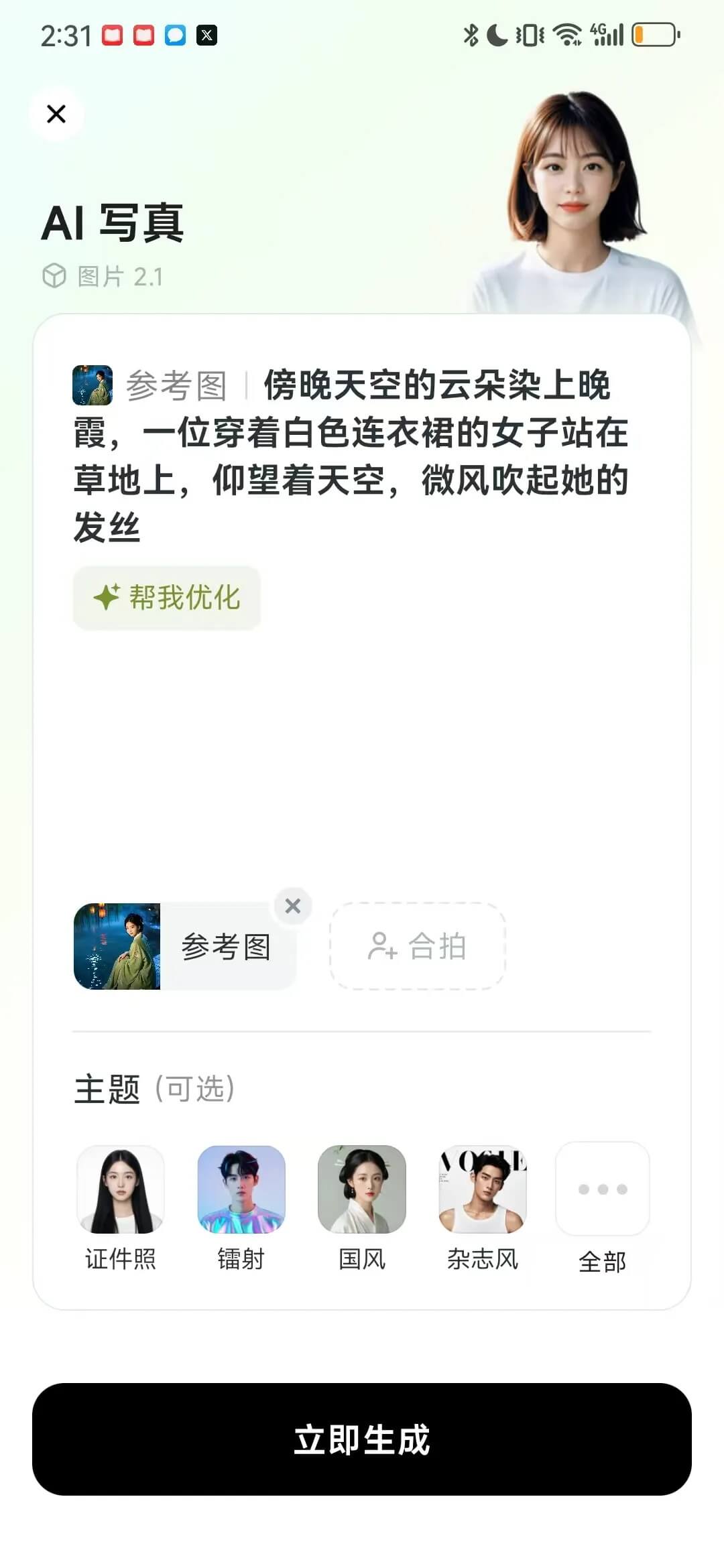 提示词都可以随机出现关键场景自动丰富,下方主题也能选择,至于传图做同款就更有意思了,这个功能可以让你上传任意带脸(可以是二次元),甚至只是一件衣服,都可以作为参考图