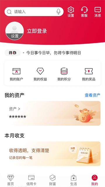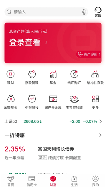 一键解锁,智富为您。推出财富管理开放平台,财富购物车、家庭财富全景视图、资产报告和资产诊断、甄选产品池、陪伴式服务、全方位安全保障六大王牌财富服务,通过专业、智能的财富管理能力,帮您管好“钱袋子”。