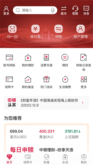 v9.9.18中国银行App是一款由中国银行推出的手机银行软件,旨在为用户提供便捷、多元化的金融服务,包含全面的账户管理、转账汇款、投资理财、跨境支付、贷款服务等众多特色功能,覆盖日常金融需求的方方面面。中国银行App还特别推出了“福仔云游记”趣味游戏和“银发专区”等特色服务,以满足不同用户群体的个性化需求。