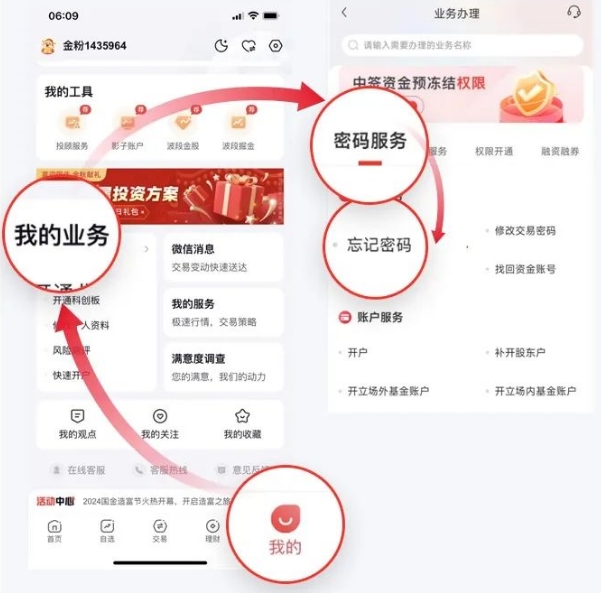 方法二:进入国金佣金宝APP,“我的”-“我的业务”-密码服务”-“忘记密码”;
