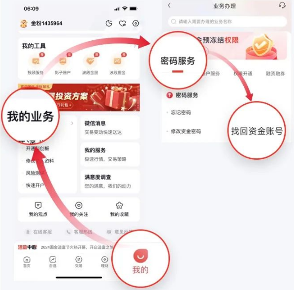 方法二:进入国金佣金宝APP,点击“我的”-“我的业务”-“密码服务”-“找回资金账号”;