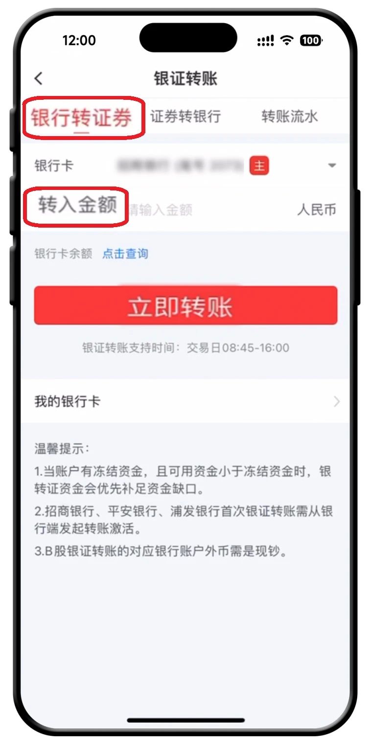 如果您选择的是银行里的钱转入证券账户,那么选【银行转证券】,选择银行卡,输入转入的金额,点击【立即转账】即可。