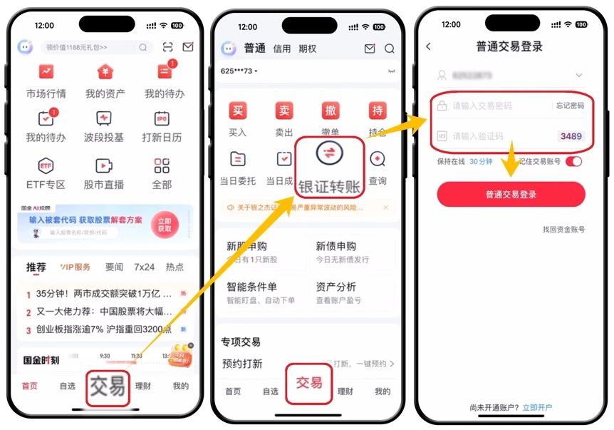 2.点击【交易】—【银证转账】—输入交易密码、验证码—【普通交易登录】