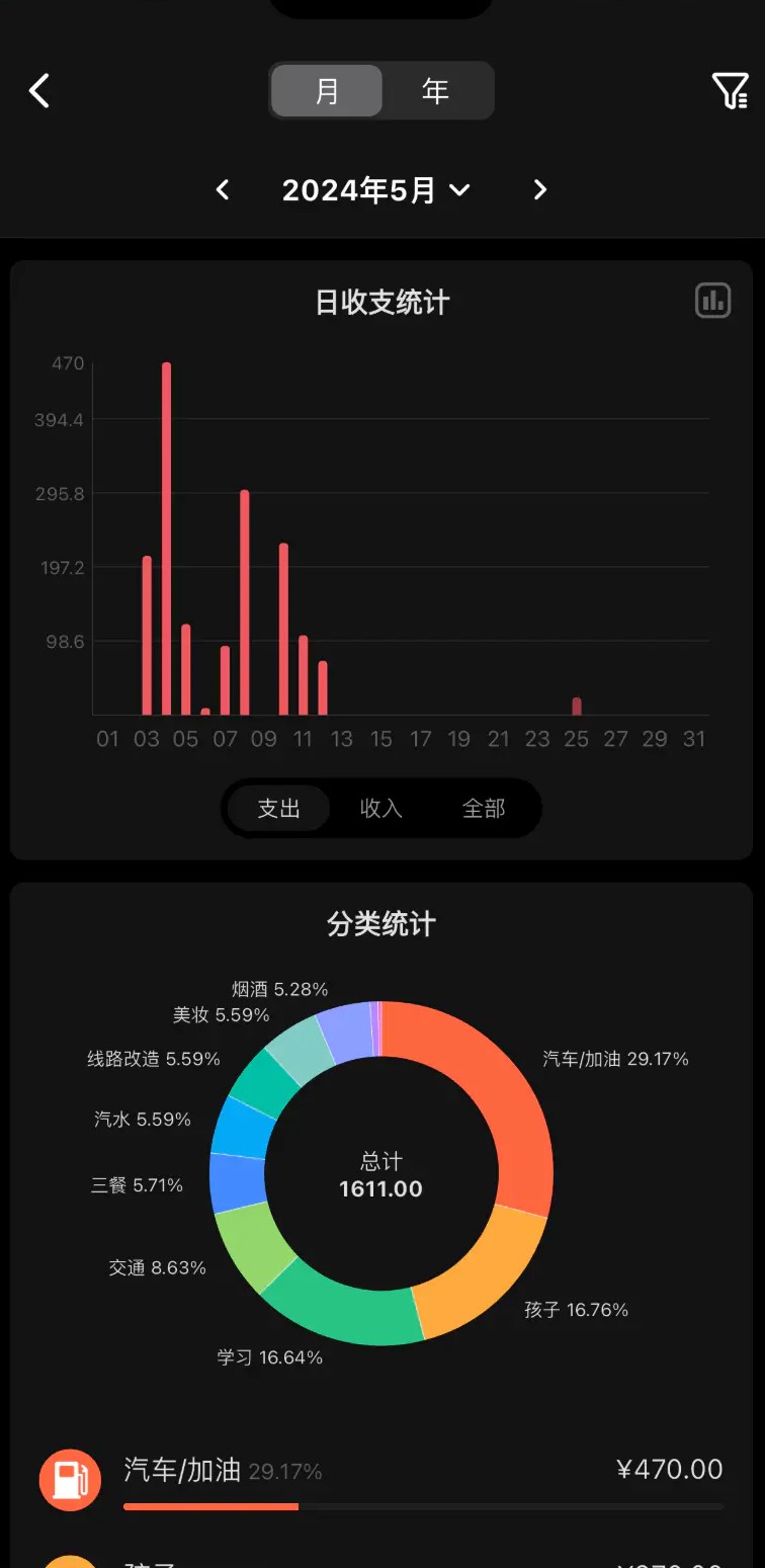导入的账单会和在钱迹记录的账单一样,在列表中都会展示出来,也支持修改,删除,查询,统计