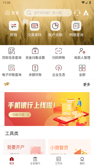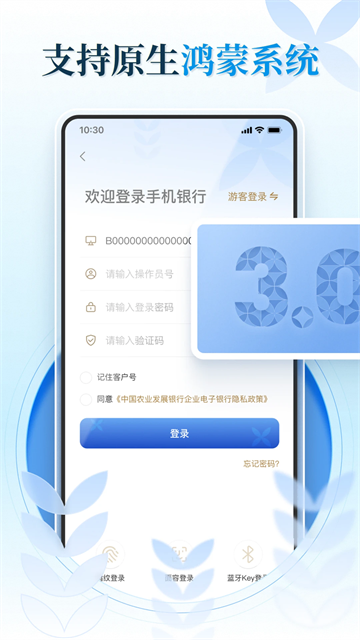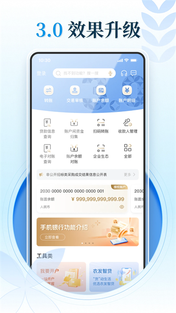 v4.0.0.0农发企业银行app是针对于中国农业发展银行企业用户开发的一款手机银行软件,为用户提供了包括账户管理、转账汇款、资金管理、企业生态等优质服务,为您打造稳定、安全、流畅的线上流程,让您畅享7×24小时便捷金融新体验。同时用户可以在农发企业银行app内可以进行多种预约操作,包括预约填单服务,覆盖账户开立预约、账户变更预约、电子银行变更预约、账户注销预约、电子银行注销预约、电子银行签约预约、定期存款/通知存款存入预约、银行本/汇票签发预约,让您开销户少跑路。不仅如此,在农发企业银行app内还可查看我行在全国范围内的网点列表及网点地址、联系电话等信息,在线咨询人工客服或智能客服网络金融业务,方便用户进行各种银行金融办理服务。