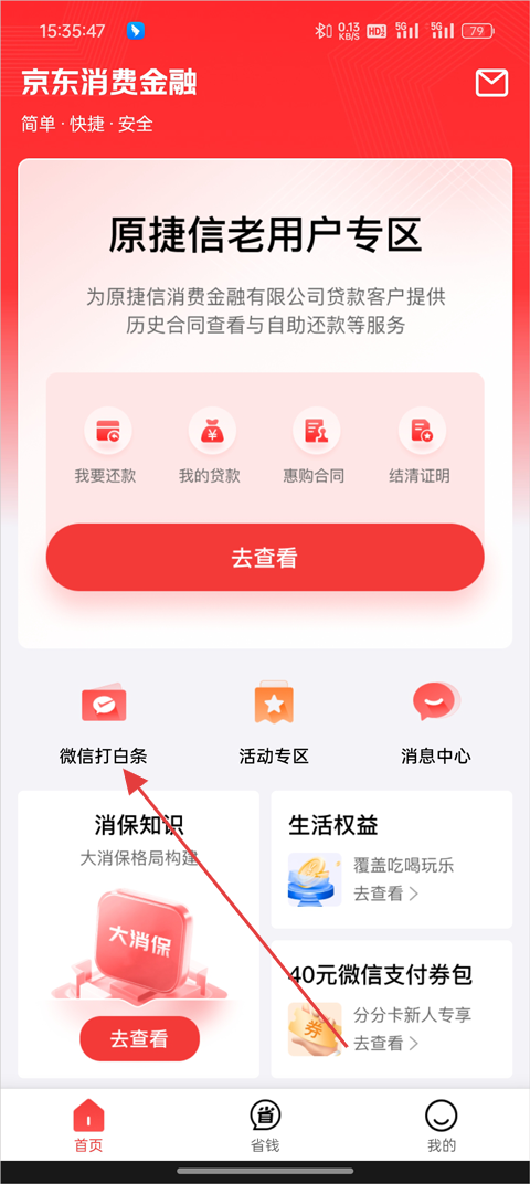 1、打开京东消费金融App后,在首页即可看到“打白条”入口,点击进入功能页。