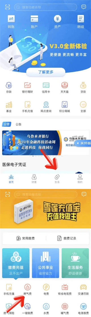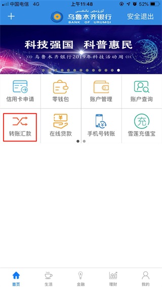 下载乌鲁木齐银行APP,进入首页,点击最下方“生活”选项。