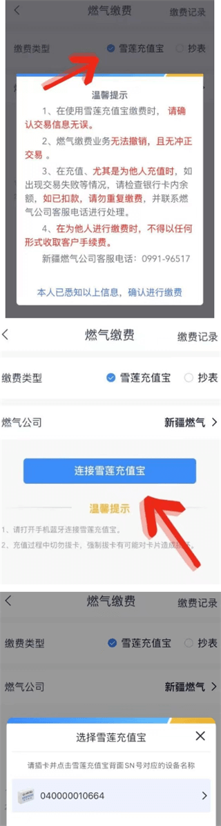 根据操作界面提示,请将燃气充值卡插入雪莲充值宝,并点击雪莲充值宝背面SN号对应的设备名称。