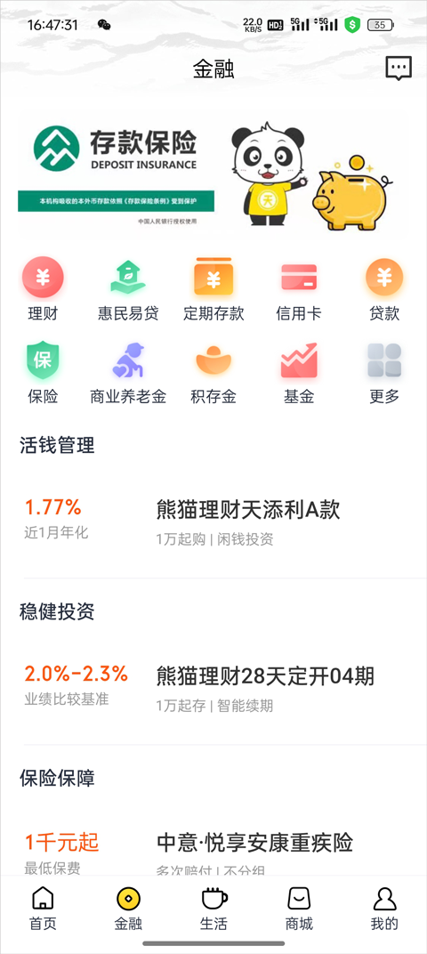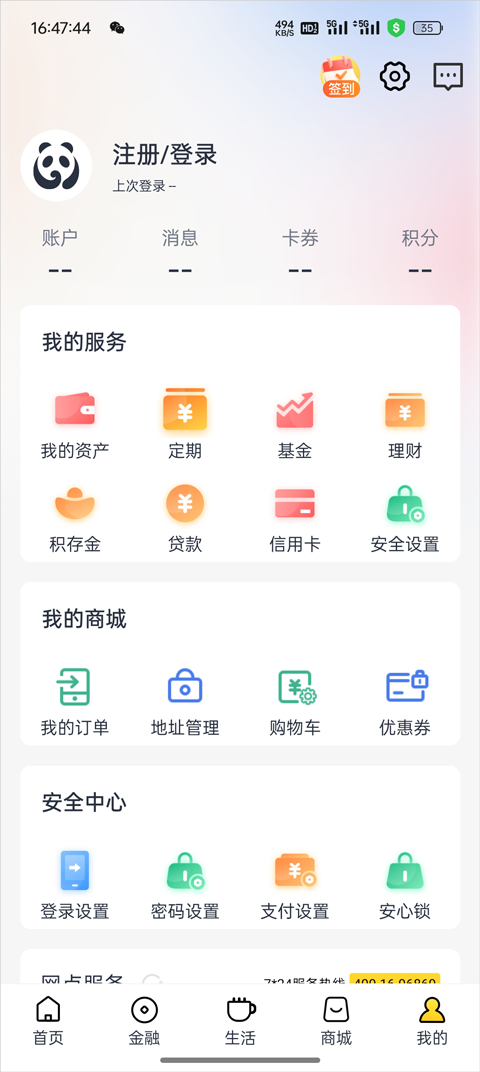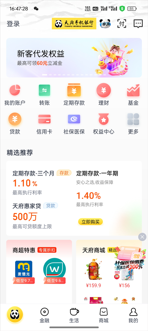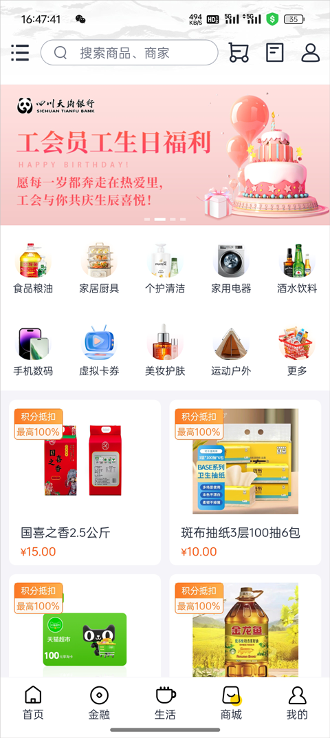 商城提供多种带有银行优惠的商品,还有积分兑换及周边金融服务专区。