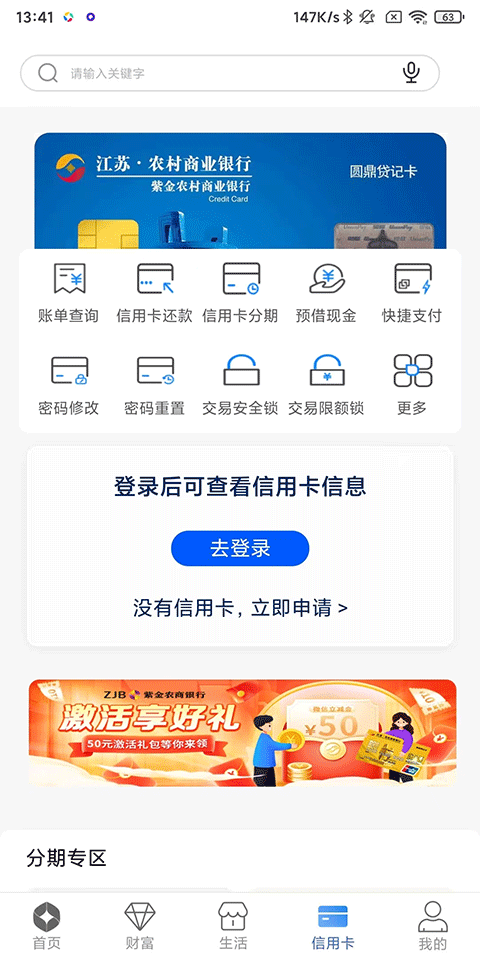 4、信用卡:申请信用卡及信用卡账单查询、还款、分期、快捷支付、密码修改等。