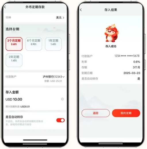 3.进入“外币定期存款”界面,选择币种、存期,填写存入金额,选择是否转存,最后输入密码,存款成功