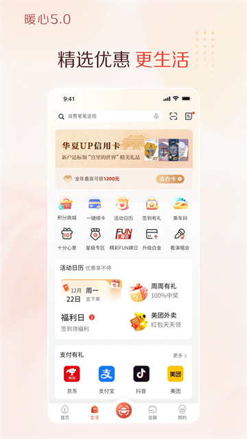 v5.2.00华彩生活App是华夏银行信用卡中心官方App,支持账单查询、实时及跨行还款、额度调整、灵活分期等操作,一应俱全。特别是视频客服和智能搜索,真正解决了“问题找不到人、信息搜不到”的痛点,在线就能完成大部分操作,省去了频繁跑网点的麻烦。华彩生活App内还可以直接参与演唱会抢票、美食拼单、观影优惠、影音会员充值、话费满减、出行加油优惠等活动,让信用卡的使用场景从“支付”扩展到“娱乐、出行、购物、生活”,几乎覆盖日常方方面面。