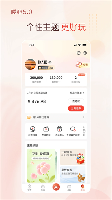 全新界面精品推荐,信用卡产品展示与申请、优惠活动宣传与推广、消费及商城分期、开卡激活与积分兑换、头条热门公告、本地服务商户接入等板块,整合优质商户资源。