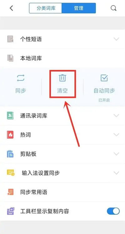 3、进入词库管理,点击“本地词库”下面“清空”。