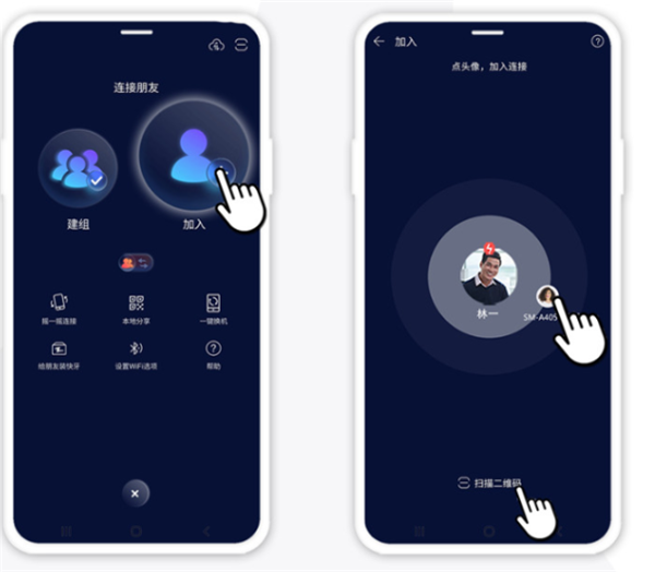 进入首页,点击下方导航栏传输按钮。进入传输界面。手机A选择接收,手机B选择发送,手机B在发送界面选好文件,然后点击发送。手机B在雷达扫出的结果里选择手机A,或者直接扫手机A的二维码,A和B就直接连接上并自动发送