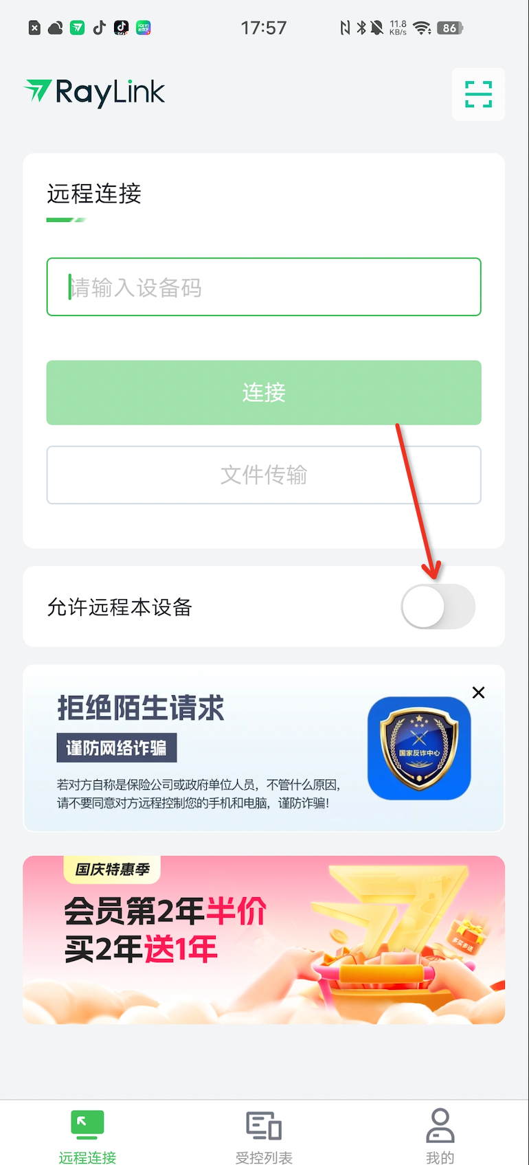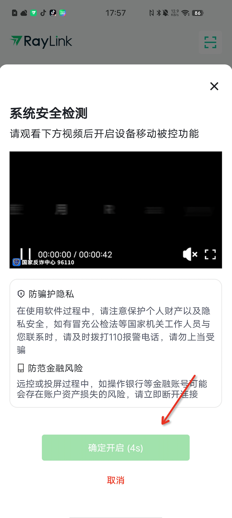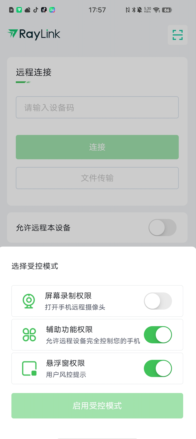 ①受控端手机安装Raylink远程控制软件后,开启【允许远程本设备】,完成系统安全检测并点击“确定开启”。
