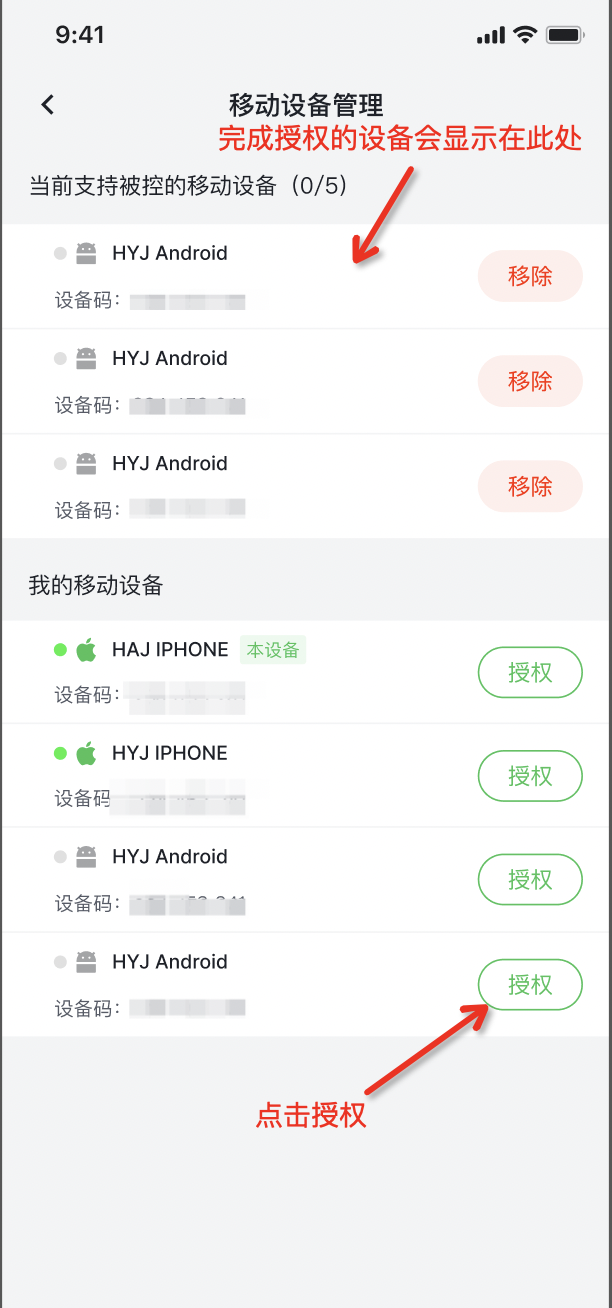 2. 授权设备:依次点击【我的】→【移动设备管理】,找到需要授权的设备,点击“授权”。完成授权后,该设备即可被远程控制。