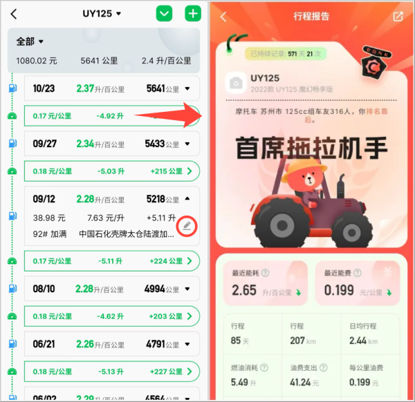 v3.8.6小熊油耗App是一款能够帮助用户精准计算爱车油耗的App,记录油耗的同时能及时帮你发现车况的异常,还可以记录下有车的生活。用户加油后记一下,通过"记油耗",用"跳枪法"精准计算油耗,比表显更准,帮助用户了解爱车的能源的消耗情况;你可以结合上下班通勤和长途自驾的油耗记录,生成精准油耗记录图表,发现油耗变化规律,及时了解车况变化,并精准判断哪个加油站的油更"耐烧";不仅如此你还可以在小熊油耗App上查看全国全年油耗排行榜单,和全国用户PK油耗水平!