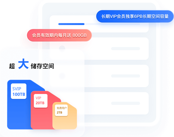 免费用户注册即送2TB容量,VIP享20TB容量,SVIP享100TB容量,长期VIP享6PB超大容量,会员有效期内,每月额外赠送800GB成长容量