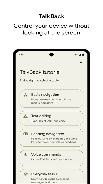 设备必须搭载 Android 6 (Android M) 或更高版本,Android 无障碍套件才能运行。如要使用 TalkBack,Wear 设备必须搭载 Wear OS 3.0 或更高版本。