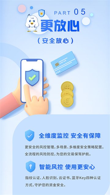 转账汇款实时到账,手续费全免,短信验证码、云证通、蓝牙key、贴膜卡认证、登录密码保护、超时自动退出、SSL加密安全传输等多种措施共同保障资金安全。